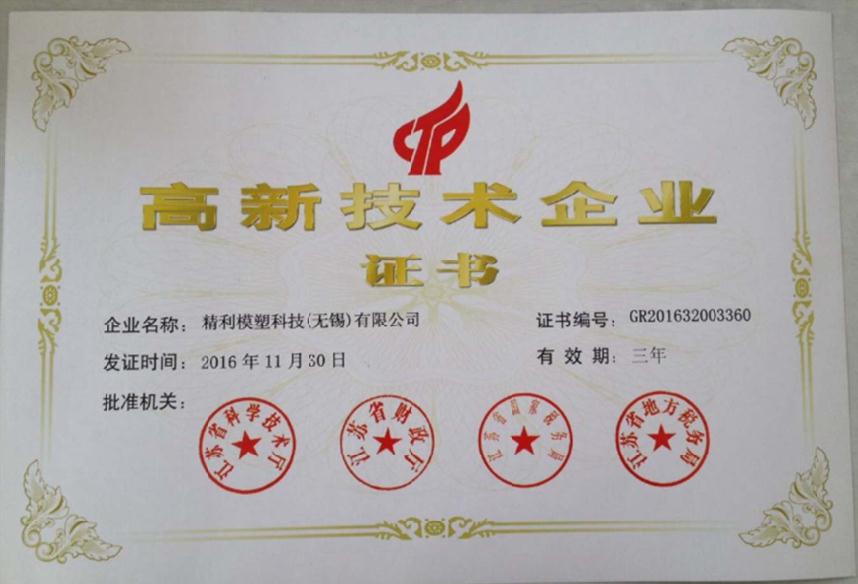 2016年11月,公司獲得了江蘇省頒發的”高新技術企業證書”。